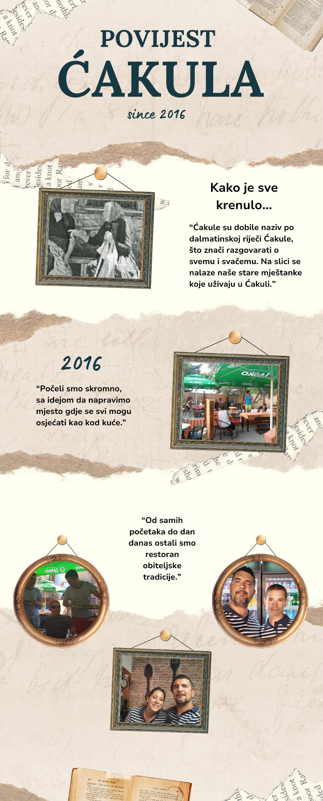 Zašto su Ćakule mjesto gdje dalmatinski duh živi punim plućima?U Ćakulama, svaki obrok je prilika da doživite pravi dalmatinski način života. Naša jela odražavaju jednostavnost i bogatstvo Dalmacije – od svježih, lokalnih sastojaka do sezonskih namirnica pripremljenih s ljubavlju prema tradiciji.Ali ono što nas izdvaja je toplina i zajedništvo koje se osjeti pri svakom obroku. Bilo da uživate u dugom ručku s obitelji ili večeri s prijateljima, Ćakule su mjesto gdje se svi osjećaju kao kod kuće. Smijeh, priče i opuštena atmosfera čine svaki trenutak posebnim, stvarajući nezaboravno iskustvo koje ćete poželjeti ponoviti.